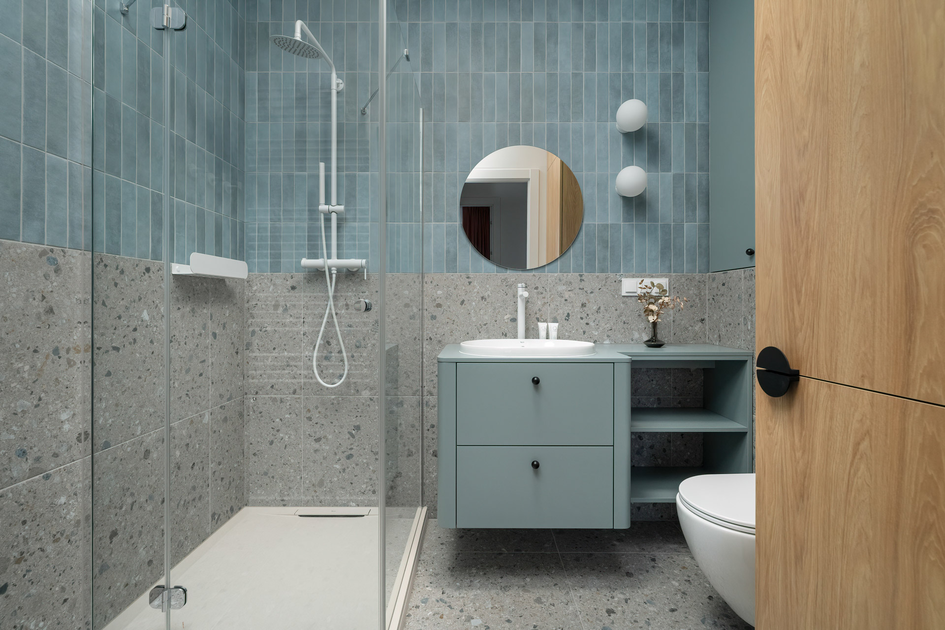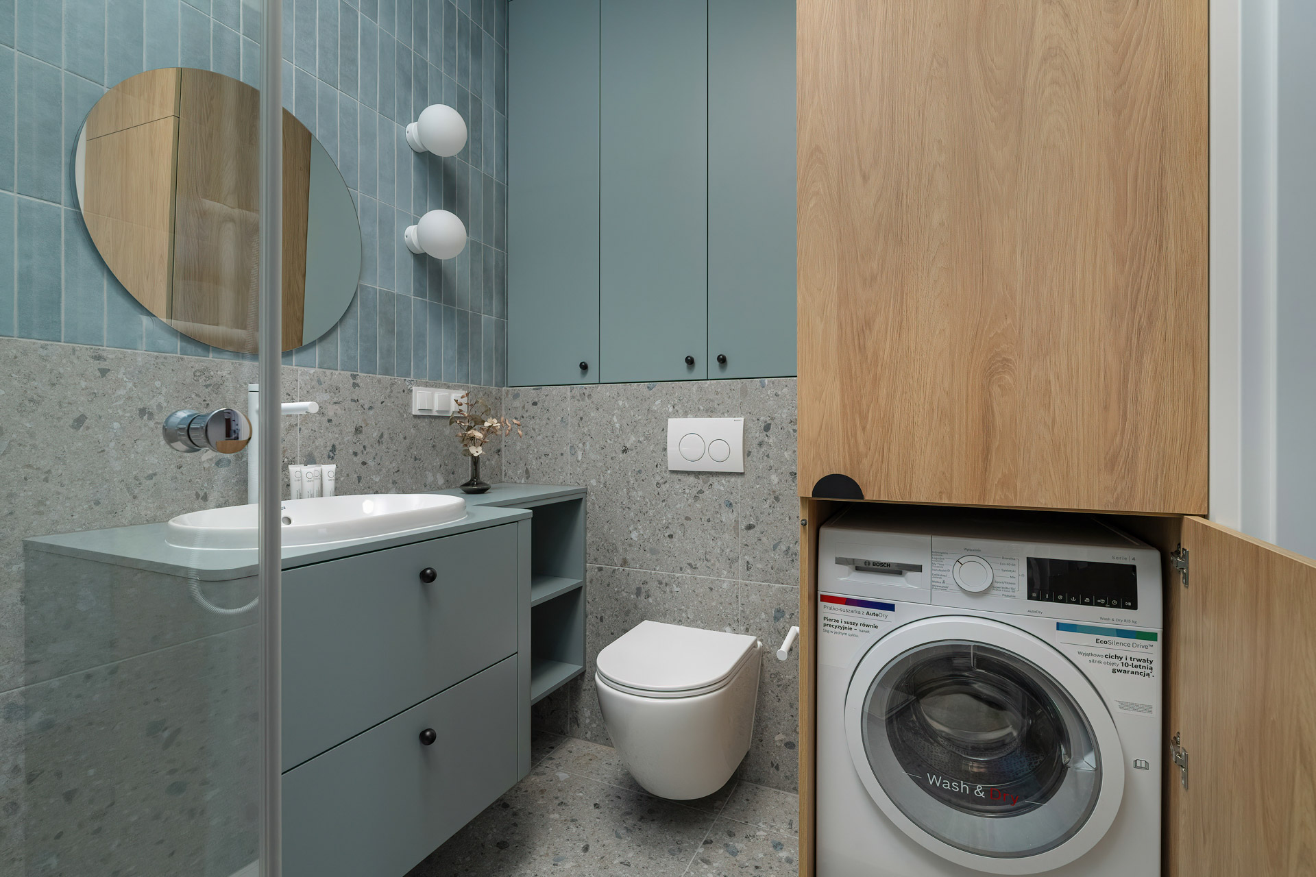 Łazienka została zaprojektowana w stylu nowoczesnym – jasne kafle, prysznic typu walk-in, pralka oraz stylowa armatura.