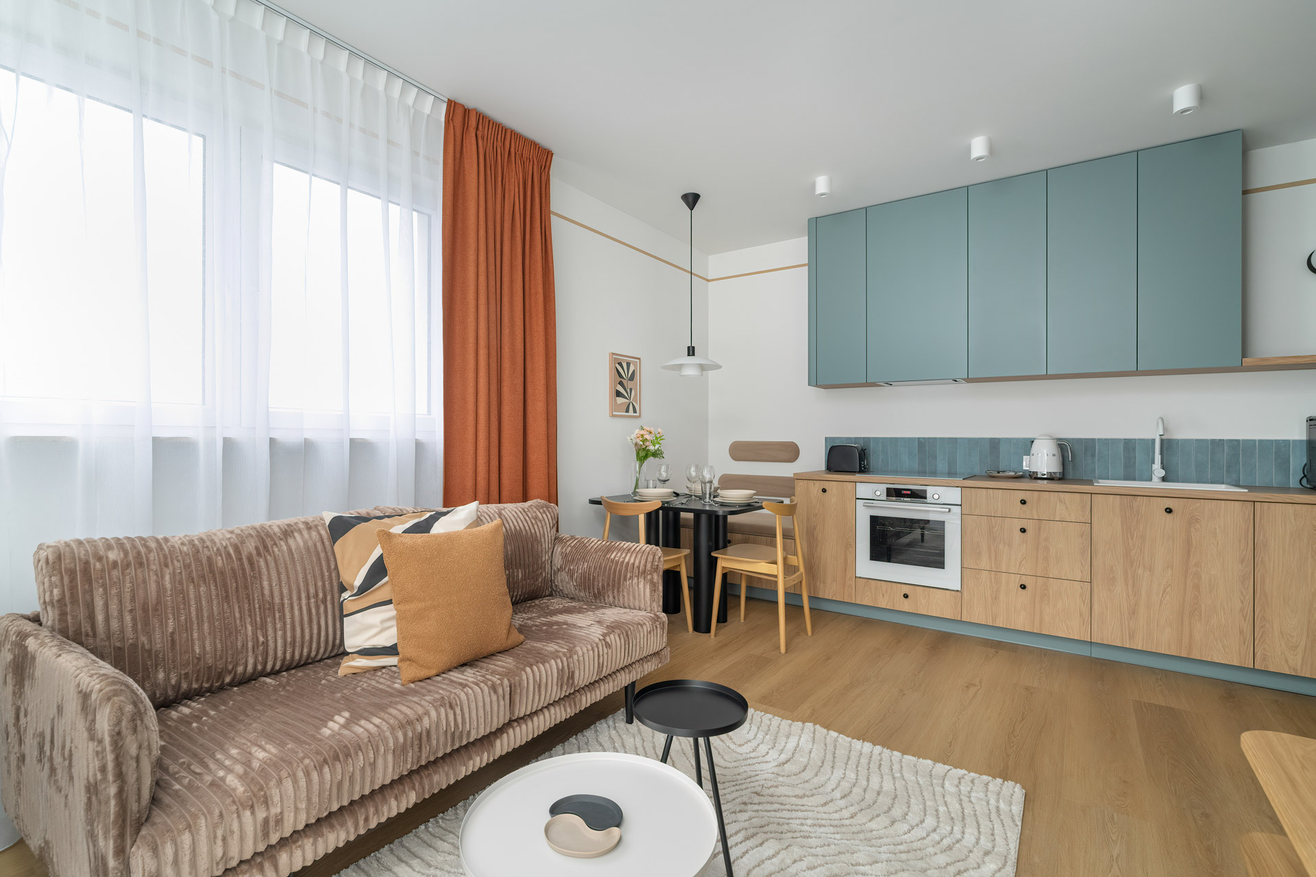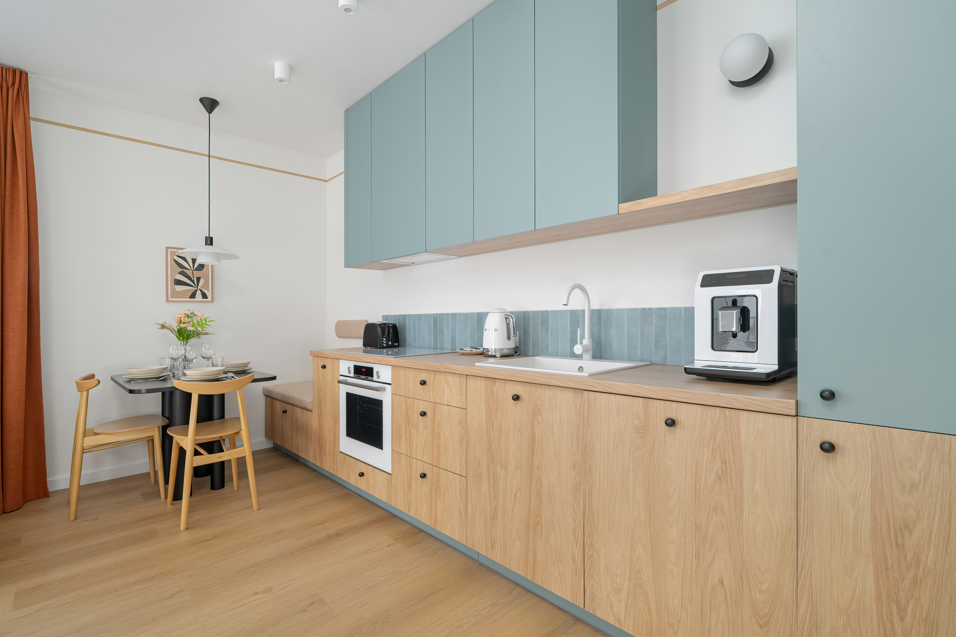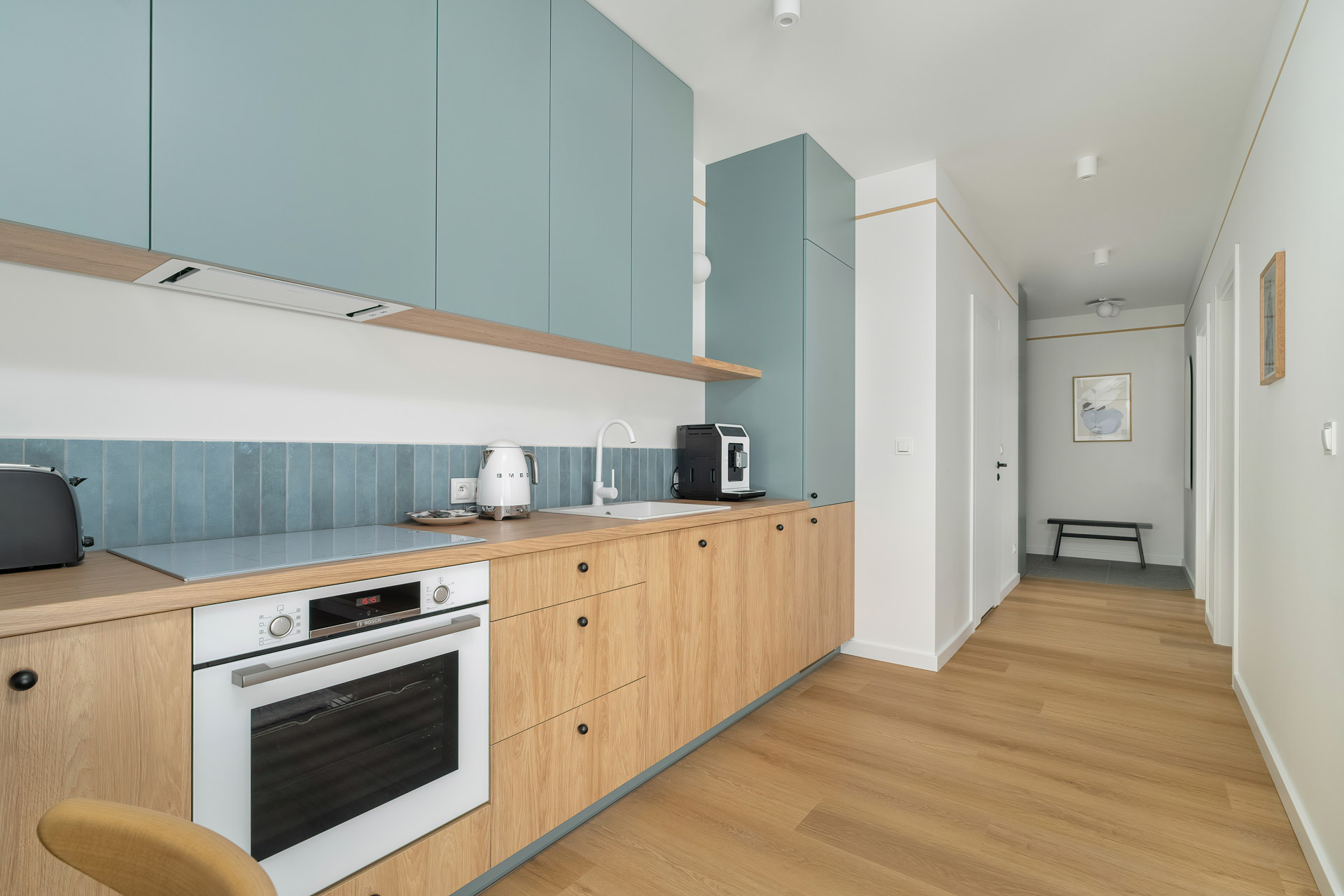 Wnętrze utrzymane jest w stonowanej, nowoczesnej stylistyce – ciepłe drewno, szarości i delikatne oświetlenie tworzą przytulny klimat. Otwarta strefa dzienna łączy kuchnię, jadalnię i salon, co daje dużą swobodę w codziennym użytkowaniu. Aneks kuchenny wyposażony jest w sprzęt AGD w zabudowie, w tym zmywarkę, piekarnik, płytę indukcyjną i lodówkę.
