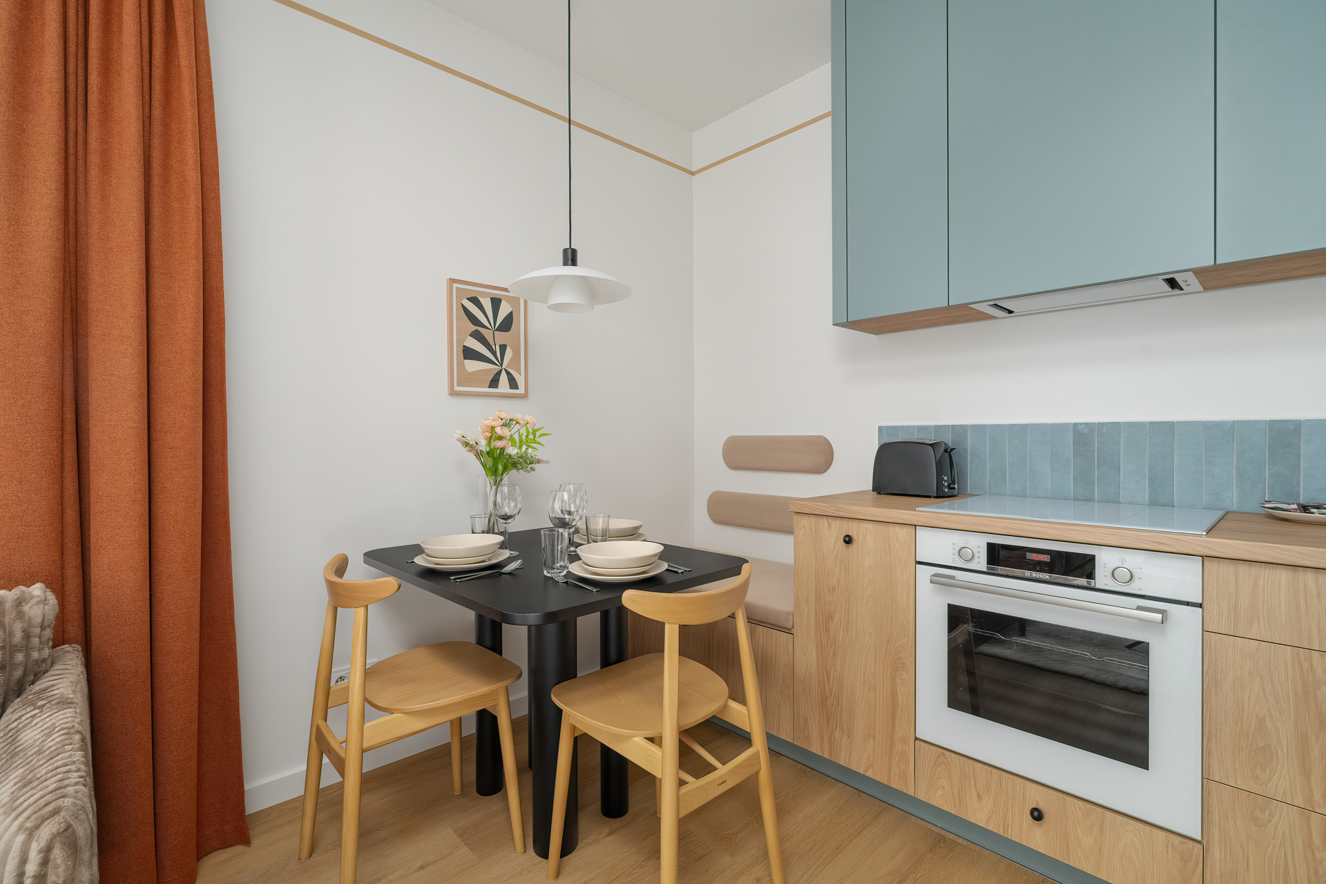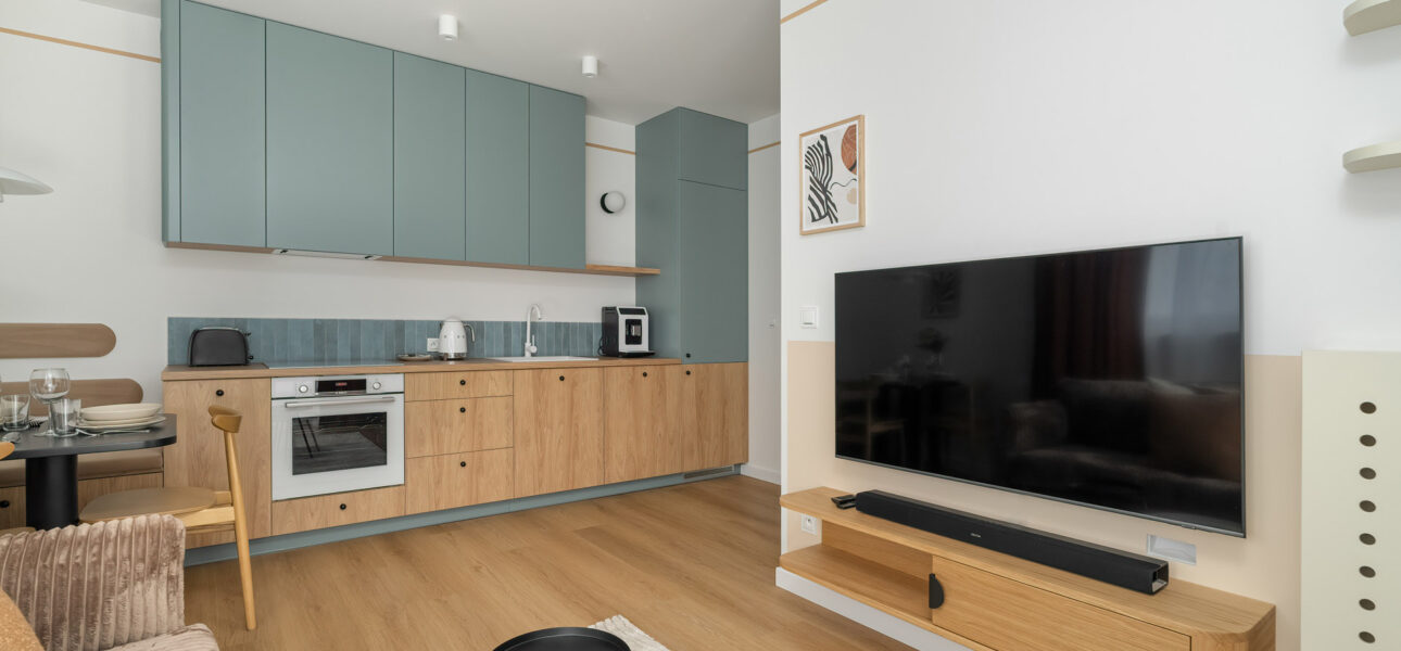 - Wykończenie: Nowoczesne, pełne umeblowanie, zabudowa meblowa, sprzęt AGD